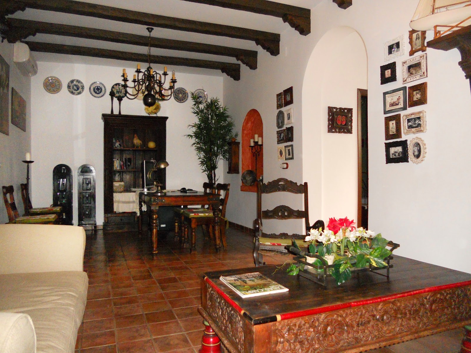 Piezas barrocas y robustas traídas de varios puntos de España de tiendas de antigüedades, madera oscura, fuente en el patio, azulejos, baldosas rustica y cerámica, con colores en la decoración como el azul, verdes, burdeos, y mostazas acompañados del blanco. Techos decorados con vigas y molduras imitando a la madera. Muchos detalles que observar.