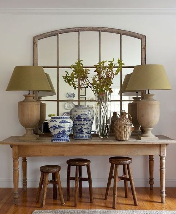 Colócalas combinadas, pero a diferentes alturas como por ejemplo la mesa de centro y la mesa auxiliar que siempre suele ser un poco más alta. O otro ejemplo puede ser un recibidor donde colocarás un jarrón encima de la consola y otro en el suelo. Será foco de todas las miradas.