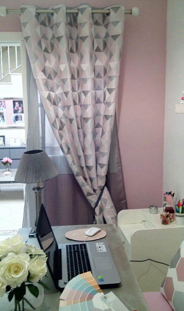Para los textilesopte por una cortina de estampado geométrico para darle un toque de atención a la ventana con un visillo gris, con unos preciosos terminales de ceramica craqueados creo que se llama esa técnica. y para mi silla nueva tapizada por un tapicero y me tiene enamorada porque siempre quise una silla rosa y con tachuelas y creo que ha quedado preciosa y para mi espalda escogí un cojín hexágono en los tonos que predominan en el estudio.