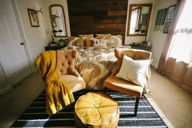 Detalles decorativos clave para conseguir este estilo: el cabecero de madera, los espejos con marcos dorados, la cabeza de hueso de ciervo, la corona de hierba… son detalles que hacen que se respire ese aire rural .