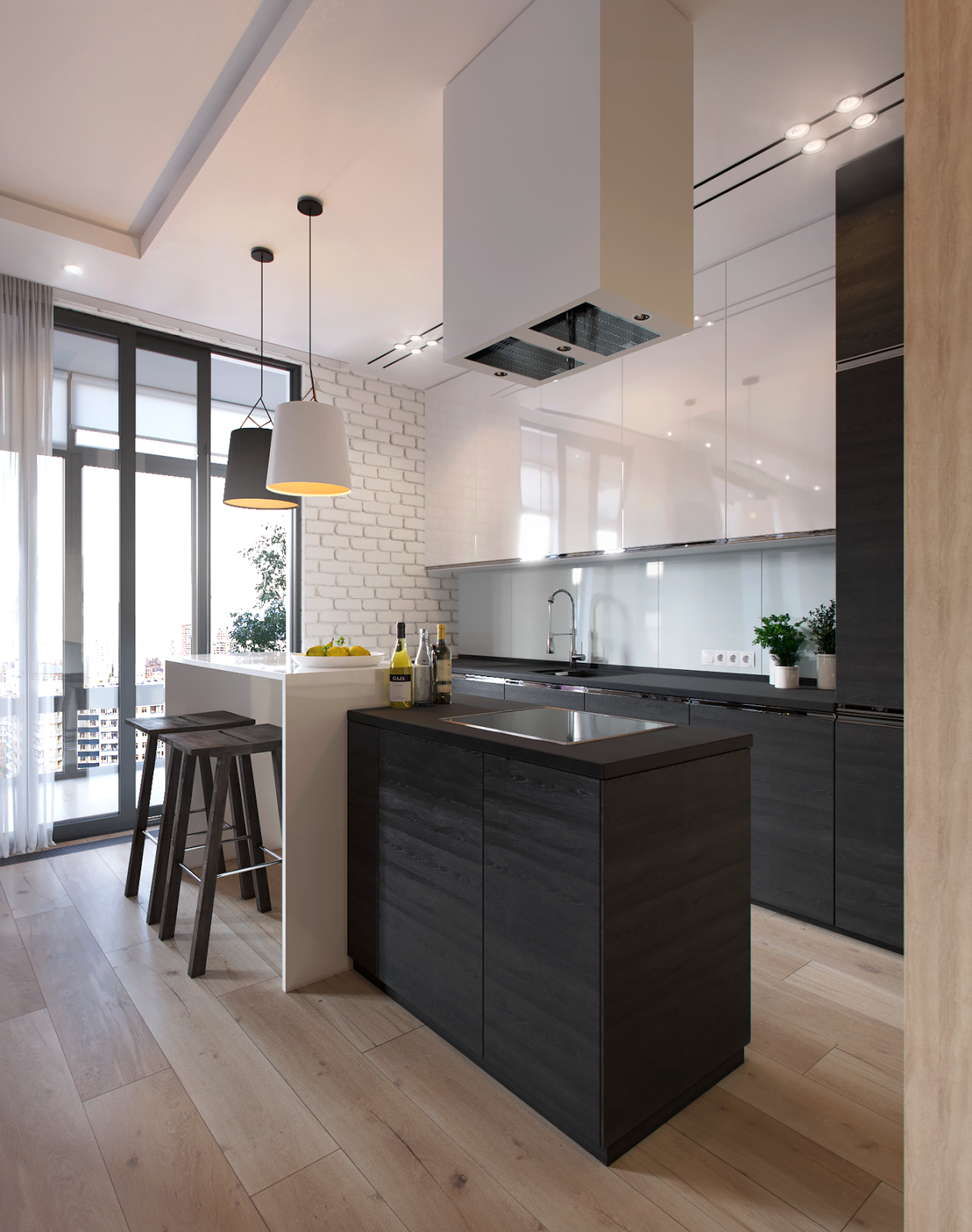 Un miniapartamento que ofrece esa primera sensación de espaciosidad gracias a los techos altos y ese suelo de imitación a la madera en un tono claro. Además le ayuda el espacio abierto entre la cocina y el salón, todo integrado como si de una sola pieza se tratase.
