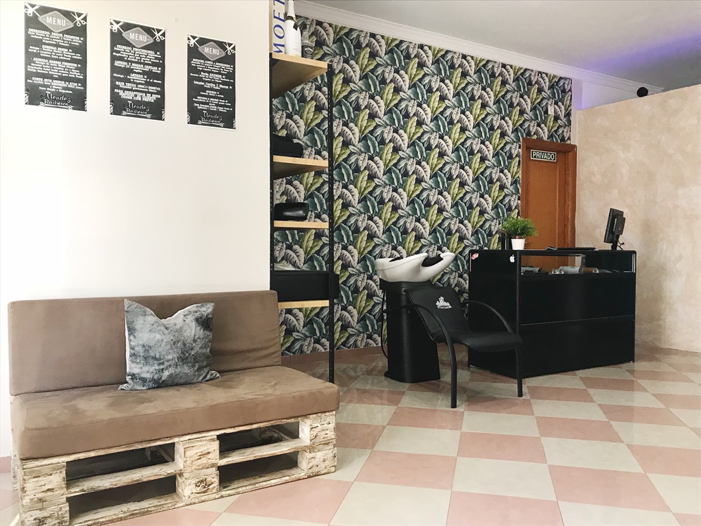 La zona de recepción y lavacabezas es donde esta la pared con el papel tropical, y como es de bonito el papel eh. Fíjate que es una zona que destaca mucho y es donde esta el punto clave, la recepción, es la primera y la última imagen que ve por el cliente, siempre tiene que irse con una buena impresión, por eso es importante.