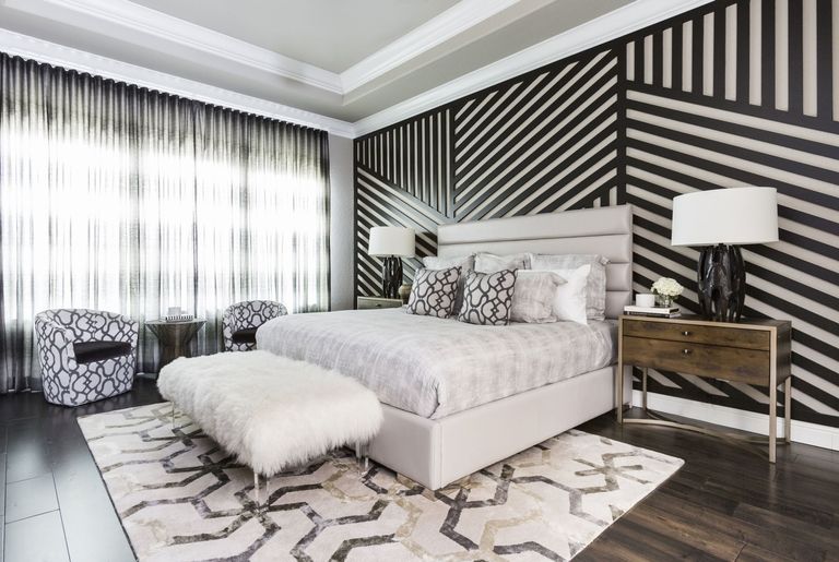 Para la habitación principal, el negro tiene mucha más presencia. Con una imponente pared geométrica, visillo negro, y para suavizar un banco con pelo. ¡Ese banco es…divino!