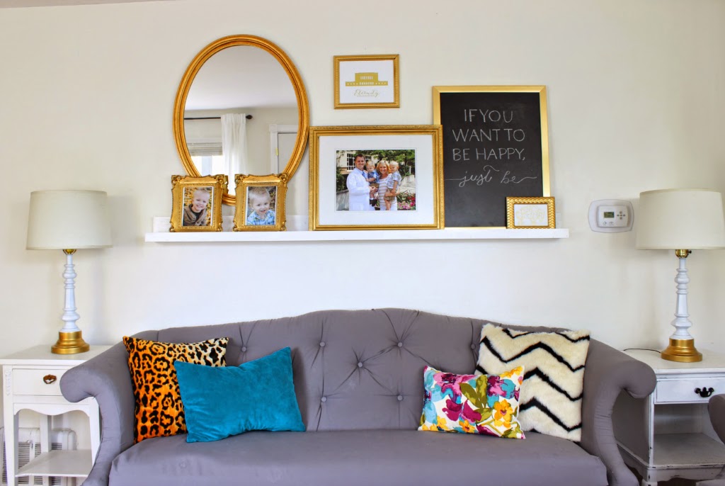Detalles como la composición de cuadros en dorado, la mezcla que forman las dos alfombras, y el toque vintage gracias a la mesa de trabajo y el mueble de la televisión.