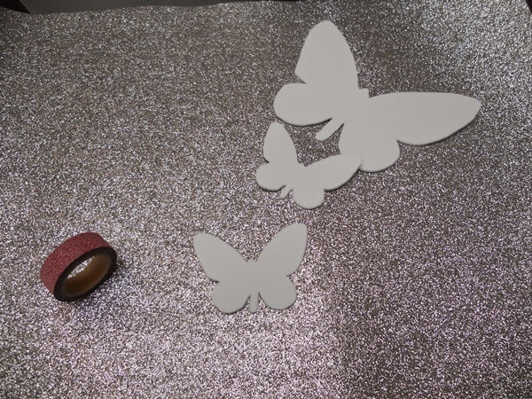 Para los centros de algunas utilicé goma eva plata y un whasitape rosa de purpurina, además saque una plantilla de mariposas que podéis descargar aquí, porque las mariposas también forman parte del jardín.