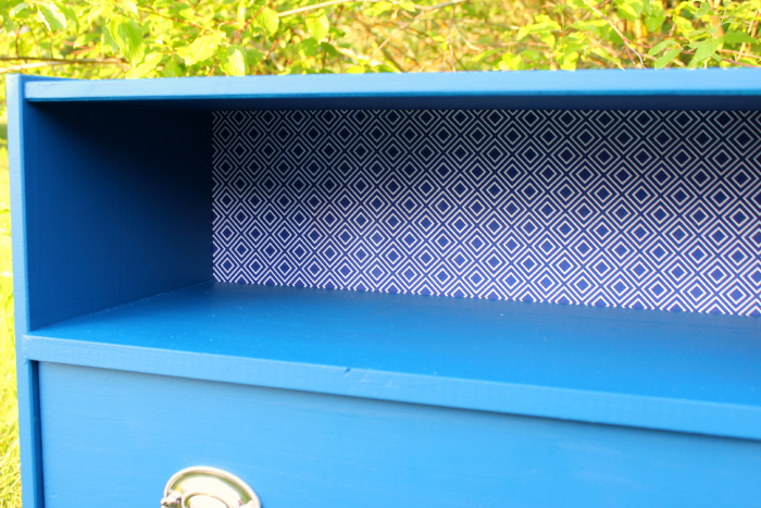 Este azul es precioso ¿verdad? Ahora vamos a colocar el trozo de tela que será el fondo del hueco. Utilizaremos cola y lo pegaremos en el tablero contrachapado de la comoda.
