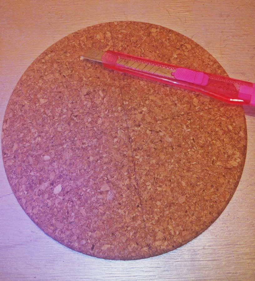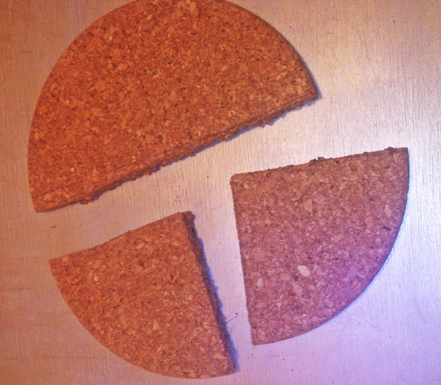 Empezamos por coger el corcho y dibujar la forma del corte de la sandía (aquí conocido como taja, por otros rincones no tengo ni idea). Pasamos a cortarlo con el cuter y ya esta listo para pintar.