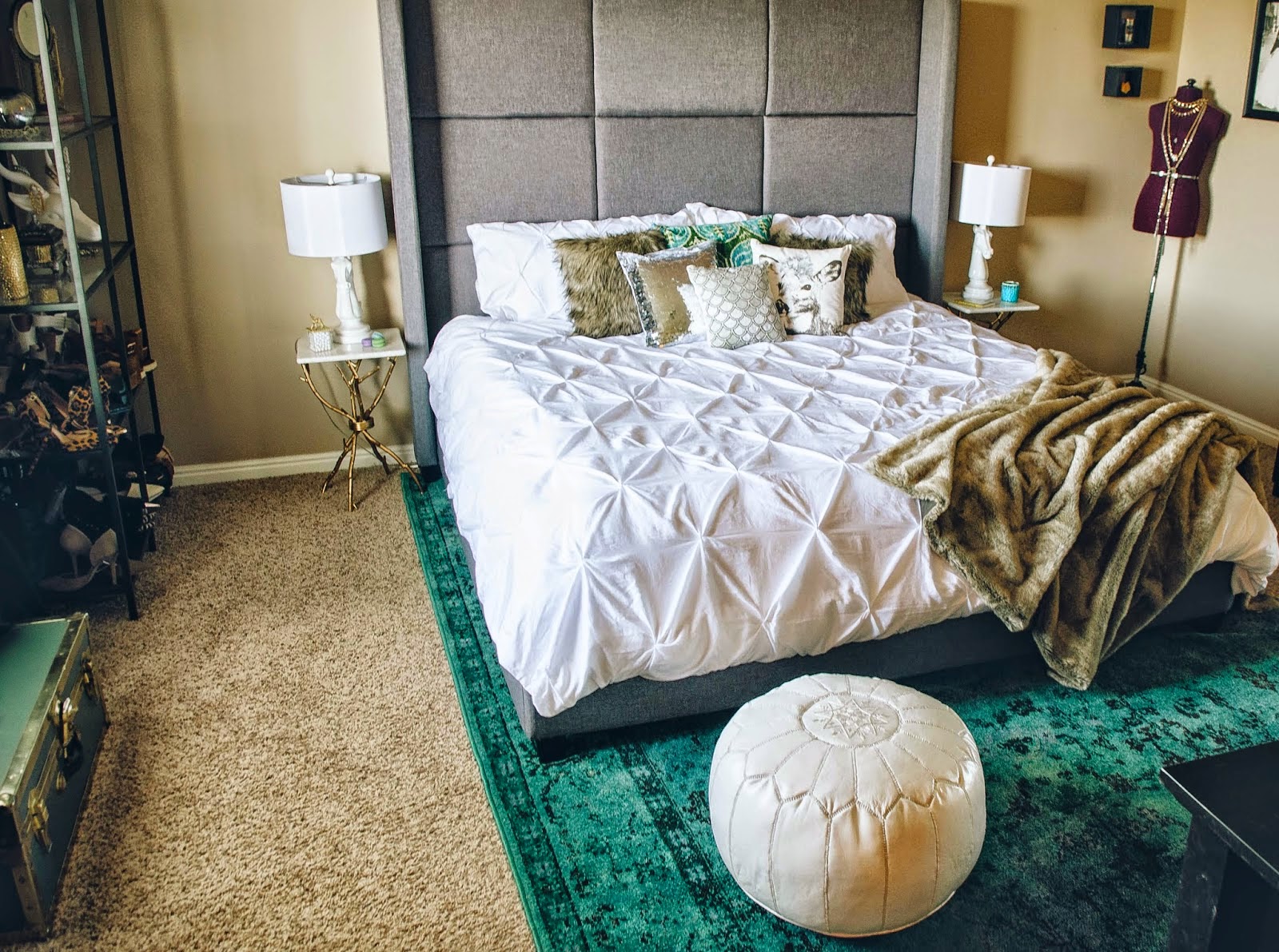 De aires vintage, con piezas que tienen mucha personalidad y que destacan por su originaridad com unas mesitas con pies de rama y base de marmol, lamparas con las silueta de la cara de un caballo, un baul sacado de una peli de piratas y alguna que otra figura de animales. Para sacar su lado acogedor se hace notar con una gran alfombra de un color verde esmeral y una manta de pelo sobre la cama, para dar el toque “glam” aposto por cojines de pelo, con lentejuelas, estampados. Asi es el dormitorio de la blogger Cara Loren y si algo destacaría es el combinación de colores para mi todo un acierto. ¿No os parece?