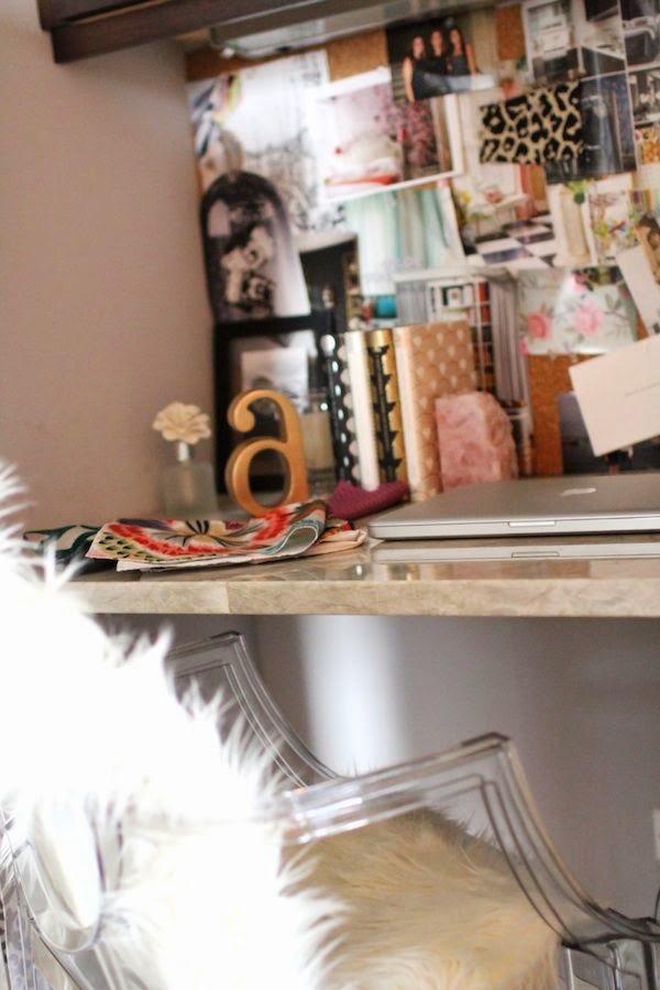 Su pequeño rincón de trabajo con un gran tablero de inspiración y montones de muestras de tejidos, pero Alex reconoce que su verdadero espacio de trabajo es la mesa de comedor o la isla de la cocina.