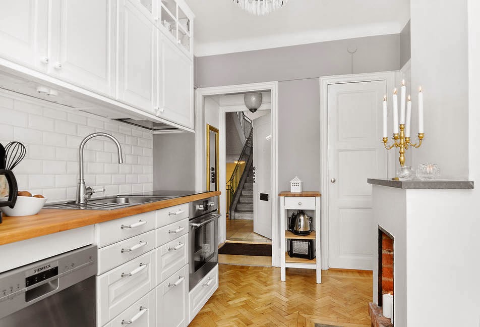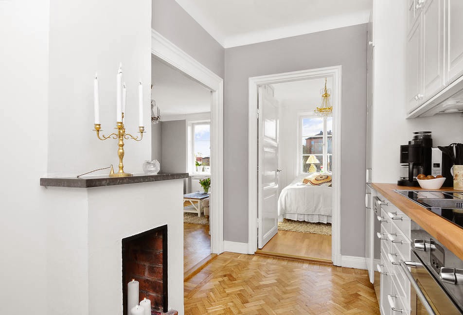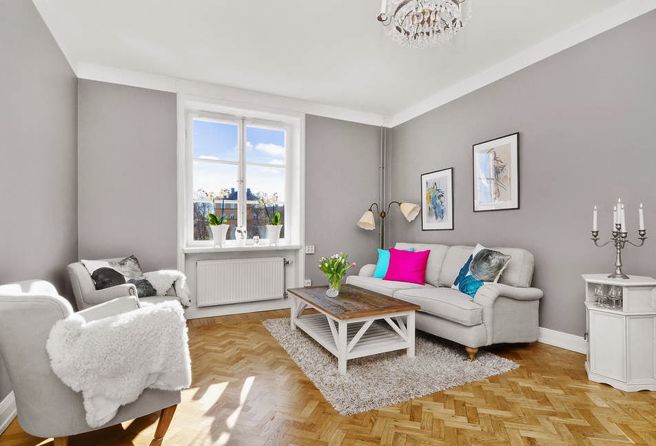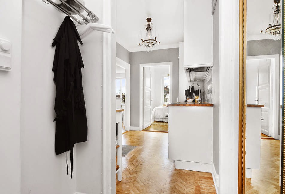 Así es este miniapartamento, nada de objetos por todas partes, ni mobiliario que obstruya la visión. Todo sencillo y minimalista de lineas clásicas que le da el mobiliario pero con esa toque nórdico con el gris y blanco de los colores para las paredes y toques de color en el textil. Lámparas chandelier por toda la casa que hacen que sea el objeto más resultón ya que siempre acaparan todas las miradas, porque no es por el espacio que exista en el miniapartamento ya que son 43 m² pero no me digáis que no están bien aprovechados.
