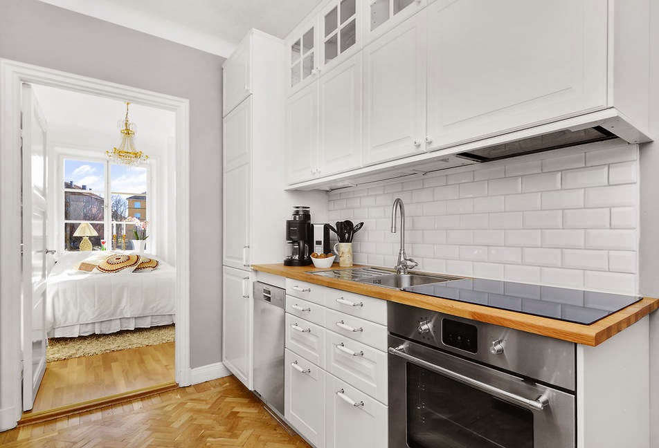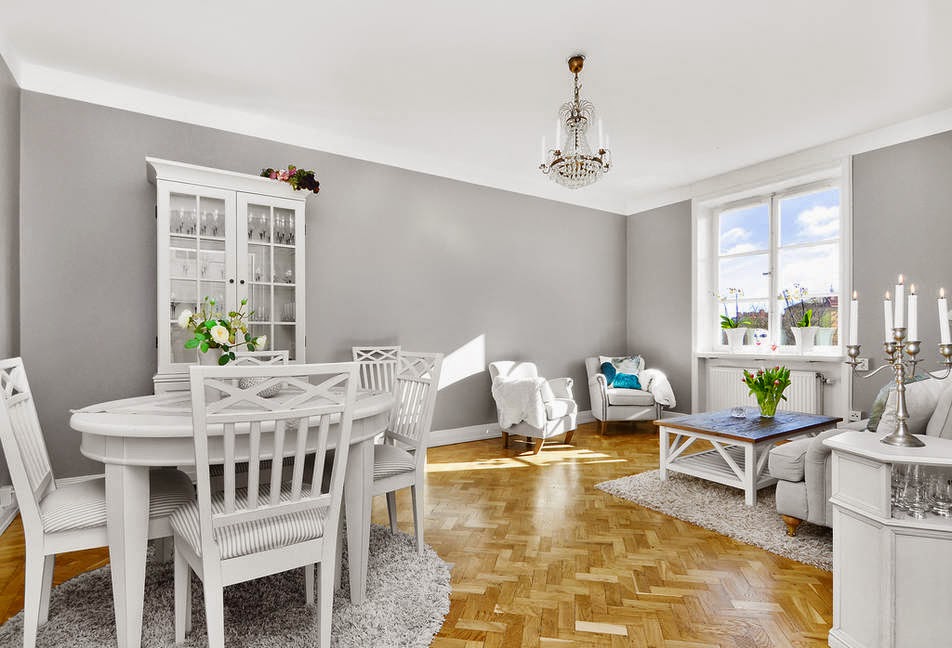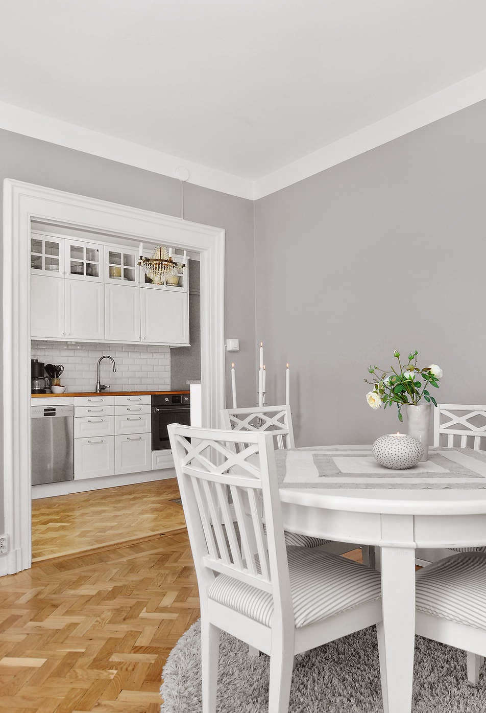 Así es este miniapartamento, nada de objetos por todas partes, ni mobiliario que obstruya la visión. Todo sencillo y minimalista de lineas clásicas que le da el mobiliario pero con esa toque nórdico con el gris y blanco de los colores para las paredes y toques de color en el textil. Lámparas chandelier por toda la casa que hacen que sea el objeto más resultón ya que siempre acaparan todas las miradas, porque no es por el espacio que exista en el miniapartamento ya que son 43 m² pero no me digáis que no están bien aprovechados.