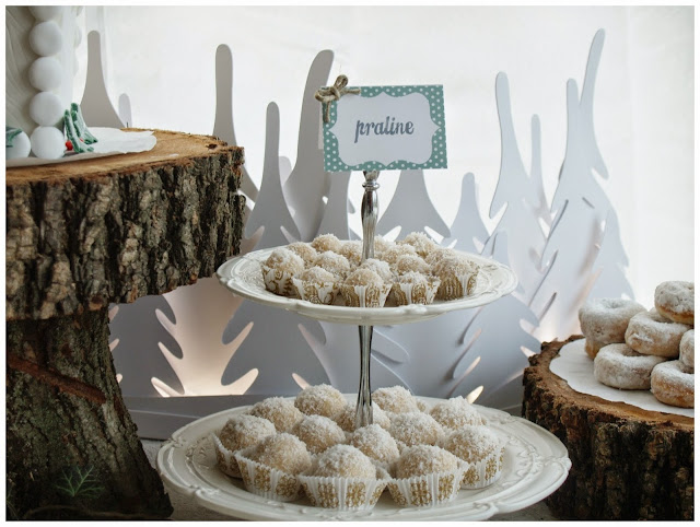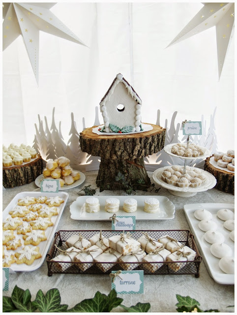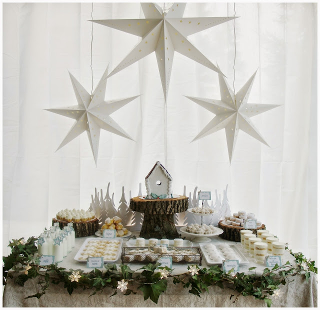 ¿A quien no le gusta un dulce, una galletita, un trozo de chocolate o buen turrón? Que levante la mano porque seria un rarete! jeje. Y si ya lo juntamos todo y lo ponemos en una mesa de dulce decorada para Navidad , ya que es una fecha tan especial seria una gran idea, sobre todo para degustar todos los dulces típicos navideños que siempre hacen nuestras abuelas, tías y madres. Y utilizando una temática invernal y no solo para estas fiestas, también quedaría fantástica para una boda de invierno ¿No creéis? Esta super bien montada no le falta detalle con esas maderas, hiedra y estrellas formando todo el decorado, incluso esos graciosos pinos de fondo; lo hacen todo más especial.