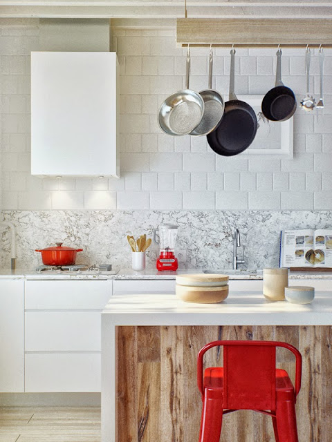 Creo que el detalle de los cacharros colgantes en la cocina – junto con los taburetes rojos – es lo que más me gusta. Es un dúplex realmente precioso.