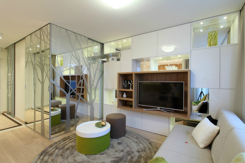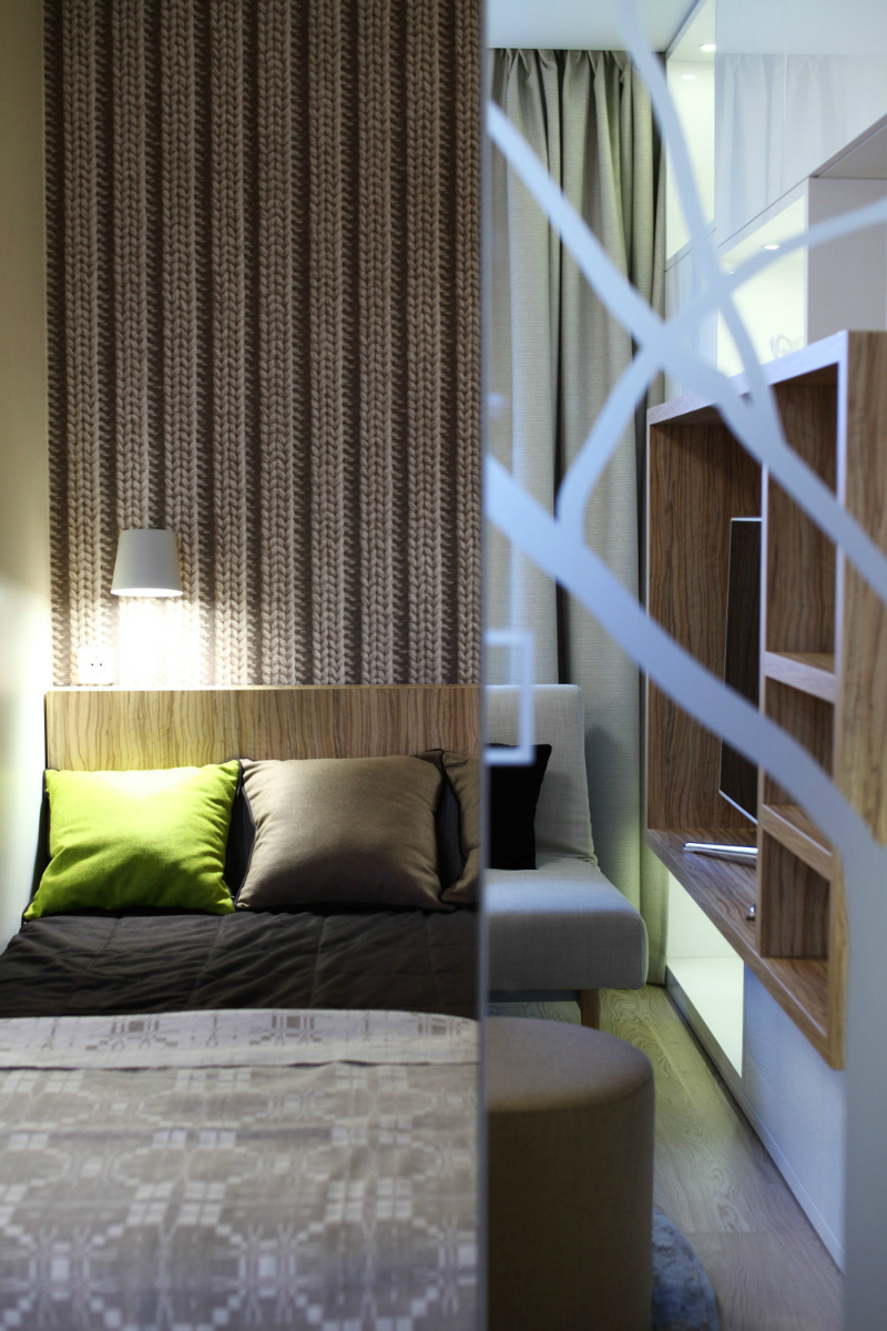 Hoy te quiero mostrar un miniapartamentoen el que si hay se puede destacar sin fijarse mucho en los detalles es la funcionalidad a pesar de sus escasos metros. Una vivienda con almacenaje oculto por cada rincón pero sin parecer que todo esta metido en una caja agolpado. Se respeta cada centímetro, distancia donde no caben agobios y puedes estar relajado en cada espacio ya que se marca cuales son las diferentes zonas. Grandes ideas, como la pared de cristal con un vinilo que atrae a la naturaleza y a la vez consigue luz dentro del dormitorio pero intimidad con el resto de la casa, detalle que es una gran idea en cuanto a los espacio pequeños. Todo es un espacio abierto pero la sensación de comodidad tan importante que es en un hogar, este miniapartamento lo cumple 100%.