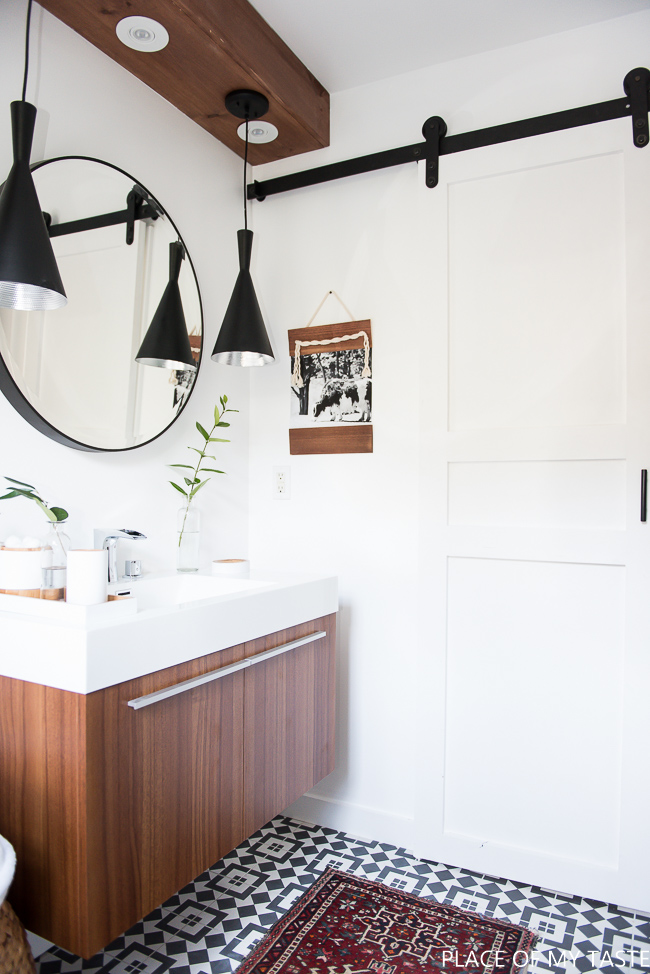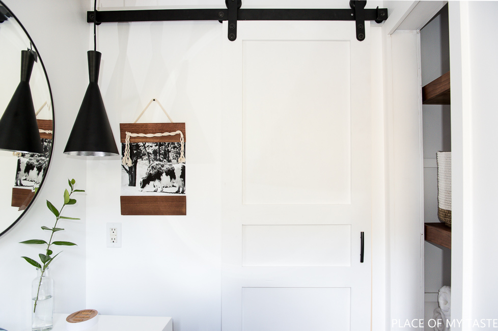 El váter si se cambió por otro y decorando ese rincón con cuadros en los que aparecen laminas en blanco y negro. Toda la decoración va en madera, incluyendo los accesorios del baño. Además el cesto de mimbre y la alfombra le dan un toque boho muy de moda.