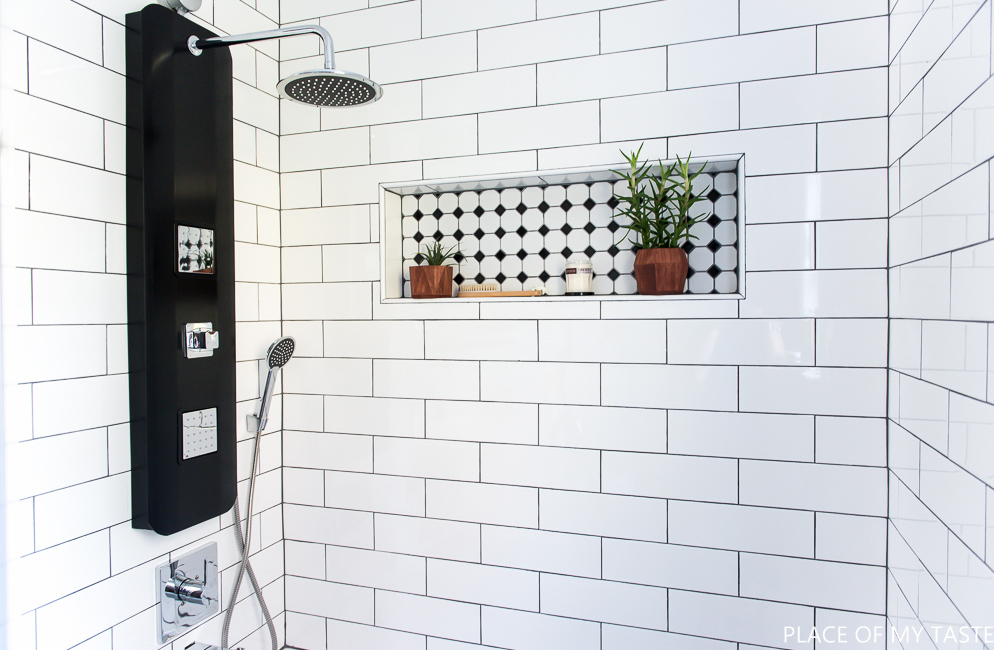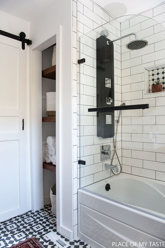 Para el suelo baldosa hidráulica y para el revestimiento de la bañera azulejo metro en blanco con la llaga en negra, además cuenta con una columna de hidromasaje, ¿Puede ser más especial la zona de baño?