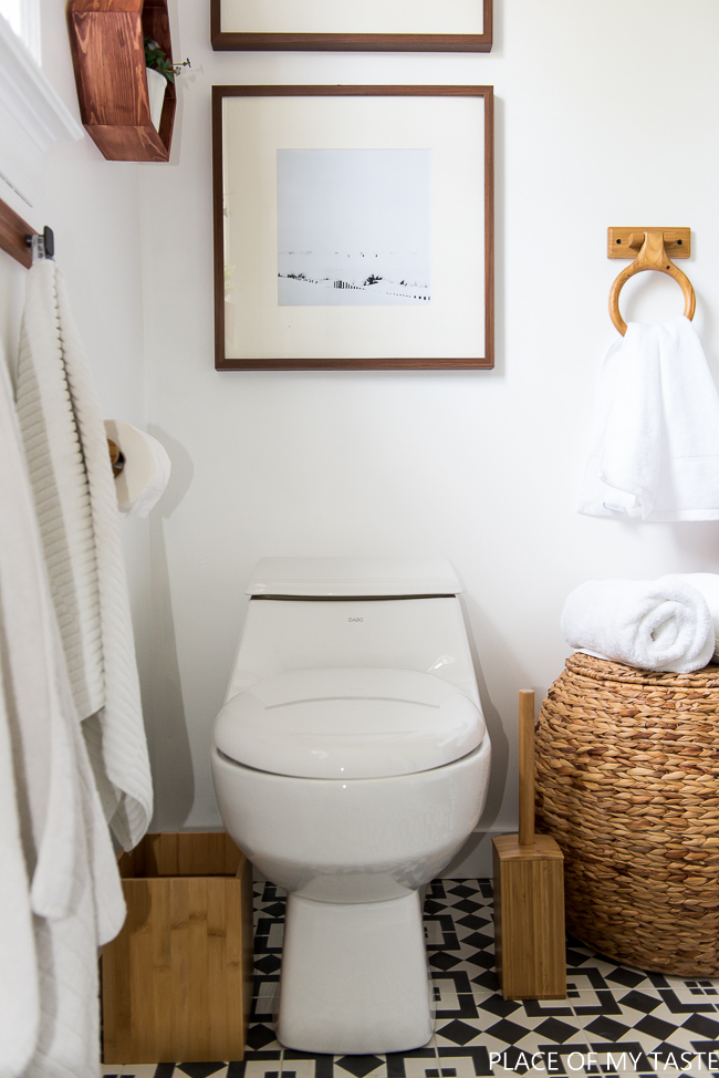 El váter si se cambió por otro y decorando ese rincón con cuadros en los que aparecen laminas en blanco y negro. Toda la decoración va en madera, incluyendo los accesorios del baño. Además el cesto de mimbre y la alfombra le dan un toque boho muy de moda.