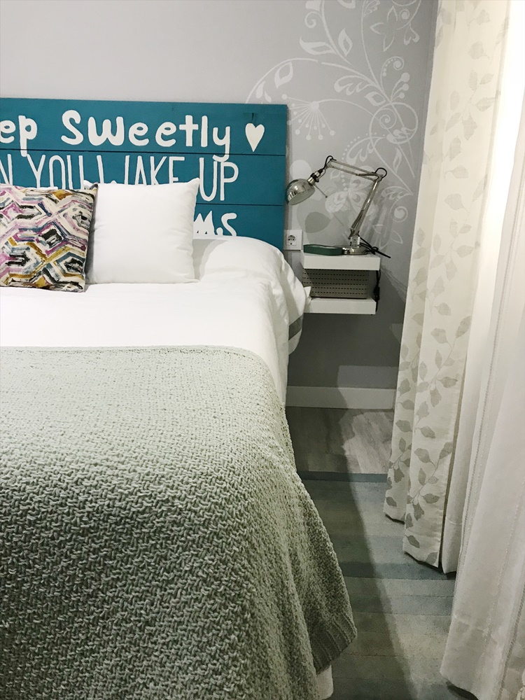 Como te he contado ella es muy manitas para el craft y quería un cabecero para su cama muy especial con una frase original, así que se puso manos a la obra y esta fué su creación.