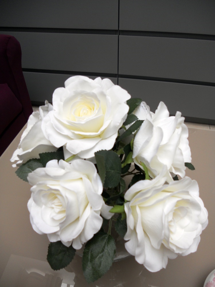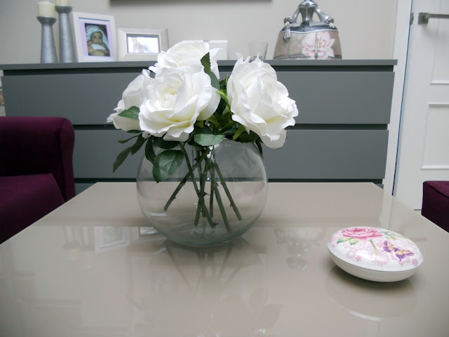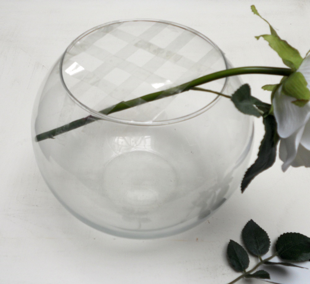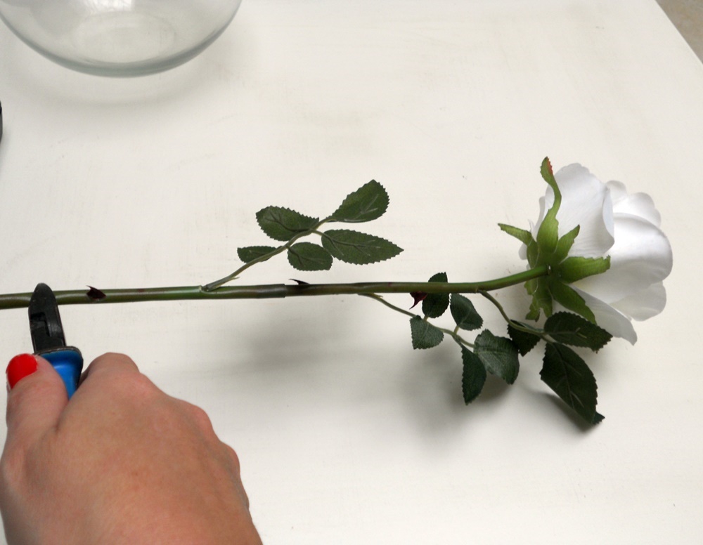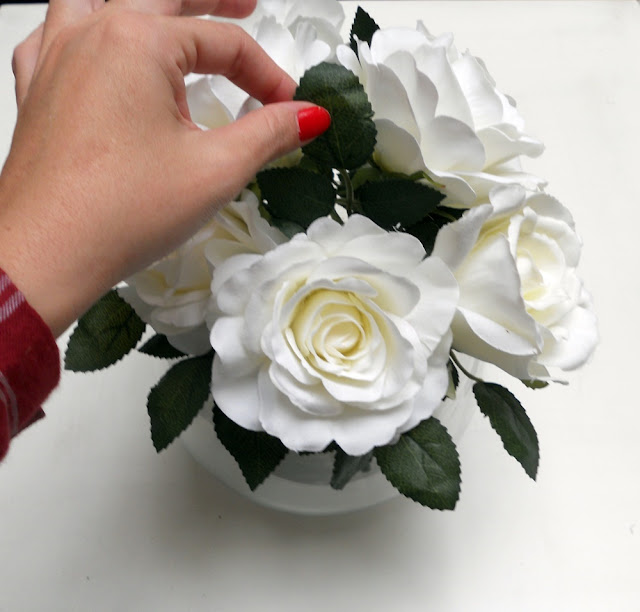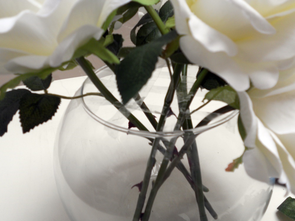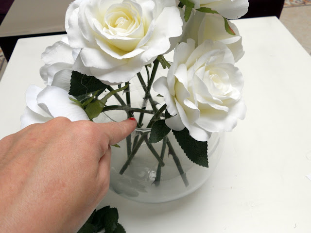 Yo opté por rosas blancas y como jarrón una pecera de Leroy Merlin