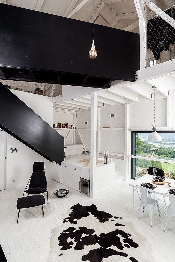 De estilo industrial, aprovechando materiales para el interior que aporte la calidez, como la madera, ladrillo visto, y malla metálica de gallinero. Los colores blanco para la luminosidad y negro para el aporte de elegancia. Con algunas piezas de diseño en la decoración, arropado por cojines de pelo, mantitas y alfombras. Increíbles ideas que se encuentran en este magnifico hogar.