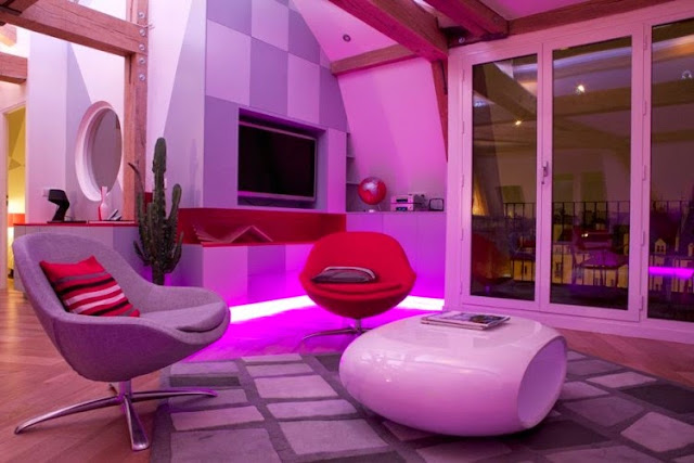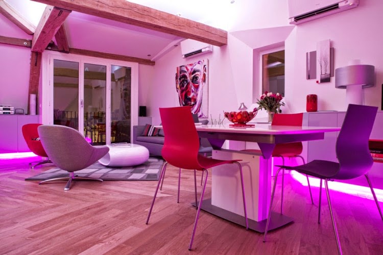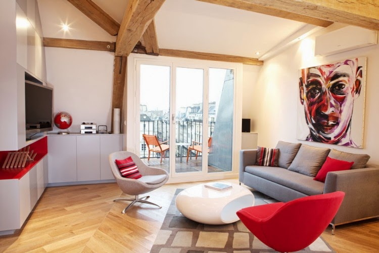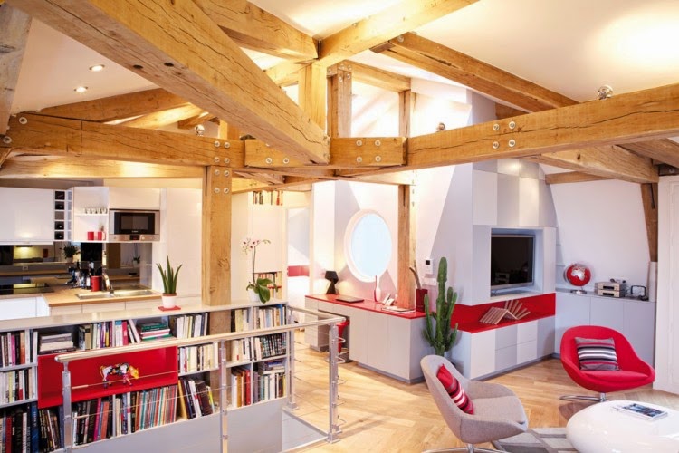 Techos con vigas de madera dando calidez y recordando el aire nórdico, mobiliario de lineas rectas de diseño y con leds, el toque del color rojo aportando la personalidad y el estilo. Un contraste fantástico entre lo nórdico y lo moderno.