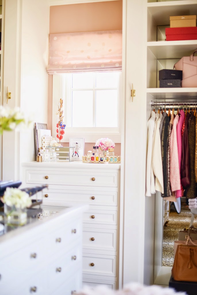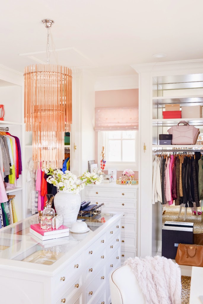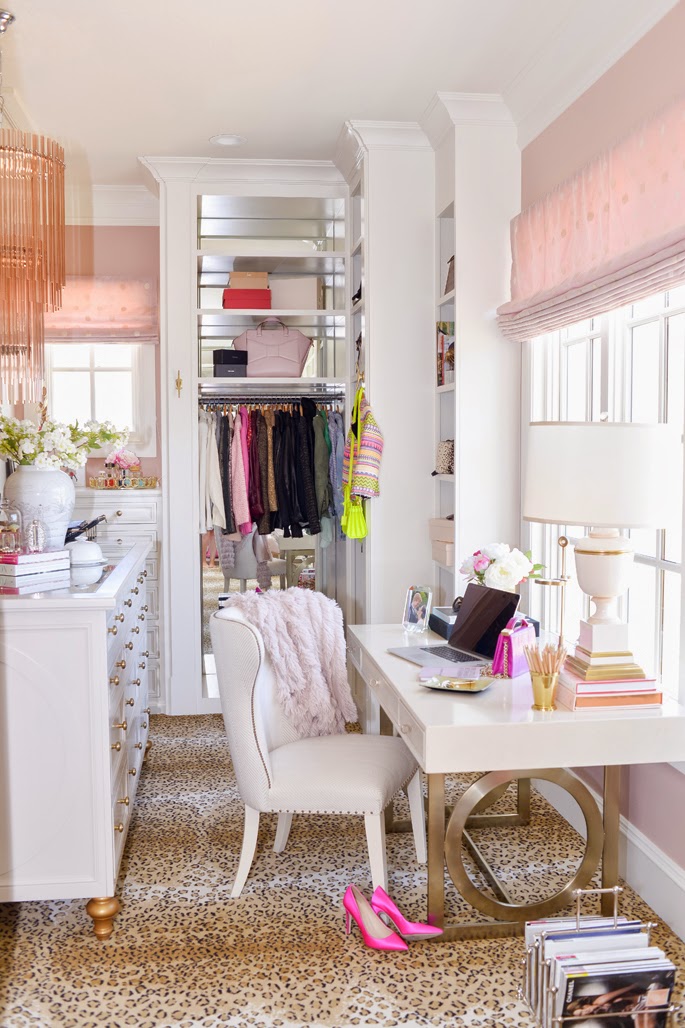 Adoro un buen vestidor de estilo glam&chic, aunque creo que casi todas deseamos tener un buen vestidor; pero si ya puedes juntar ese precioso vestidor con una pequeña oficina eso ya es lo más. Hoy os quiero enseñar un vestidor/oficina de una blogger la cual sigo porque me gusta muchísimo su estilo y gusto por la decoración, es Rach de Pink Peonies. Pues ha ido decorando su casa poco a poco y con mucho estilo. Lo ultimo ha sido su vestidor / oficina, un diseño de Alice Lane Home. Tonos claros blancos, rosados y oro, por no hablar de la moqueta, un print de leopardo (me quede prendada)
