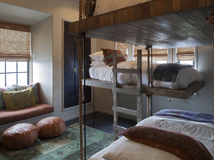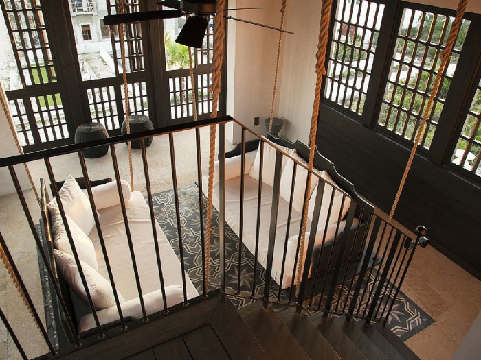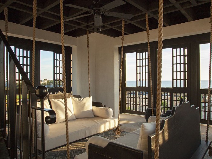 El salón esta separado de la cocina – comedor por un mueble que tiene una celosía de estilo marroquí consigue hacer una pequeña separación con estilo y elegancia. Pero cada mínimo detalle esta cuidado y pensado, como el baño o un rincón para desconectar. Han conseguido captar el estilo sin haber un exceso y es lo que más atrae la atención. Suelos con baldosas hidráulicas mezclados con madera, sofás colgantes que te invitan a descansar.