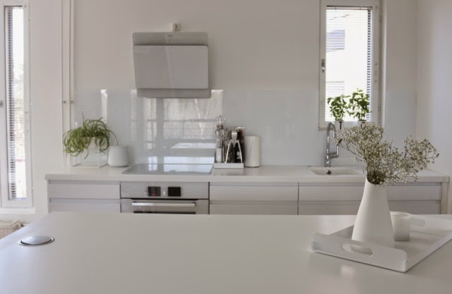 Pues la cocina de hoy tiene todos los detalles que puede tener una buena cocina: almacenaje, zona de desayuno, cerca de la zona de comedor y mucha luz. Mobiliario blanco, decoración blanca, solo resalta el verde de las plantas.